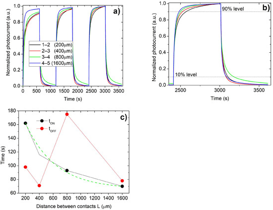 To complete the investigation on the contact–semiconductor interfaces and their effect on the performance of photoresistors, the time-dependent photoresponse for different contact spacing was investigated by performing on–off illumination cycles with UV light (254 nm). The normalized photocurrent for three subsequent on–off cycles is plotted in Figure 8a for the four contact distances of the TLM pattern in a two-point probe configuration by fixing the ratio between applied voltage and contact distance at 0.125 V/μm for each pair of adjacent contacts.