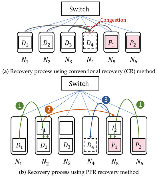 The recovery method that repeats a single stripe: Existing single-stripe recovery algorithms primarily focus on how to quickly transmit surviving blocks, how to obtain the optimal recovery scheme, and how to schedule recovery links. Recovery algorithms that focus on the rapid transmission of surviving blocks utilize idle bandwidth to accelerate recovery without reducing the recovery traffic. Figure 1a shows the recovery process for damaged block using the conventional recovery method (CR) with RS(4,2) coding. When using the CR method for single-stripe recovery, all helper blocks are transmitted to the target node simultaneously, without involving any specific design optimizations or strategies. As shown in Figure 1a, this process requires transmitting 4 surviving blocks to the target node (the node where the recovered block is stored) . Obviously, using conventional recovery can cause congestion in the download link of the node, so it takes four time slots to recover the damaged block. PPR [4] decomposes single-block recovery into multiple sub-phases and executes these sub-phases in parallel to alleviate network congestion, thereby achieving the goal of fully utilizing available bandwidth. Figure 1b describes the recovery process for the damaged block using PPR [4] recovery with RS(4,2) coding. It can complete the recovery in the following three time slots. (i) In the first time slot, is sent to , and it is linearly combined with , as shown in Equation (1), to generate the intermediate block , while is sent to to generate another intermediate block . (ii) In the second time slot, is sent to , and is linearly combined with to recover the damaged block . (iii) In the third time slot, the recovered block is sent to the storage node . Therefore, PPR [4] can fully utilize the available bandwidth in each time slot to mitigate network congestion issues in single-block recovery. However, PPR [4] overlooks the rack architecture, which may trigger extensive cross-rack data transfers and impact recovery performance. ECPipe [22] further reduces the recovery time to a single time slot by breaking down the recovery of the damaged block into multiple smaller sub-blocks for pipelined recovery. When these two methods are applied to batch recovery, they simply repeat the recovery method of a single stripe. This approach fails to fully utilize the bandwidth in each time slot, which may inadvertently cause link congestion and reduce bandwidth utilization.