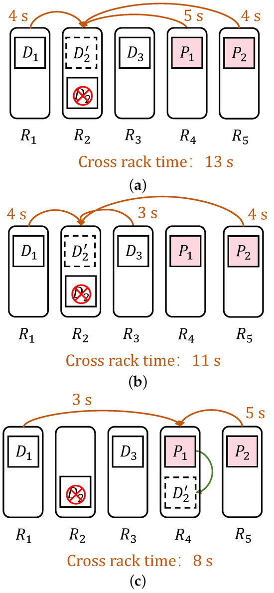 Cross-rack transmission time for different recovery schemes using the CR method. (a) Using the CR method to randomly select help blocks and target nodes for recovery scheme; (b) Using the CR method to select a recovery scheme different from the help blocks in (a); (c) Using the CR method to select a recovery scheme different from the target node in (a).