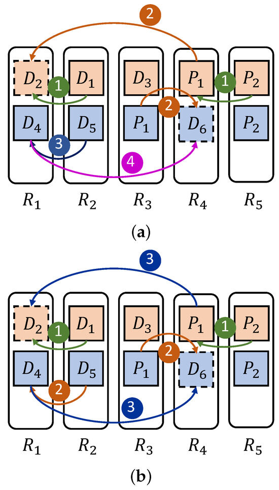 Algorithm details: Before elaborating on the specific steps of Algorithm 2, it is necessary to explain that the number of lines in the following description refers to the number of lines of code in Algorithm 2. Given a set of recovery links allLinks, this paper first calculates the upstream and downstream access counts for each rack and the congestion level of each link (Lines 1–2 in Algorithm 2), and then groups the links according to the strips they are recovering (Line 3). The links within the same group are sorted in descending order based on their congestion level, and for each group, we calculate the single-strip recovery time, as well as the sum of the upload links for the upload racks within the group (Lines 4–7). The groups are then sorted in descending order based on their single-strip recovery time. If there are groups with the same single-strip recovery time, in order to make the total recovery time BT equal to the maximum transmission time MT as much as possible, the links in the groups with fewer selectable links per uploading rack on average should be prioritized for scheduling. This means these groups should be sorted in ascending order based on the sum of the upload links for the upload racks within the group (Line 8). Algorithm 2 sets up three variables and one array: send_rack and recv_rack record the racks currently sending and receiving data, respectively; tran_link records the link currently transmitting data; the link_execute array records whether each link has been scheduled. The three variables are initialized as empty sets, indicating that no racks are uploading or downloading data and no links are transmitting data; the elements in the link_execute array are initialized to 0, indicating that all links have not been scheduled yet (Line 9). Then, Algorithm 2 iterates through the links in each group in the order of the groups, and after sorting in descending order, the links with higher congestion levels in each group will be scheduled earlier (Lines 10–24). For the link → , if both the uplink of and the downlink of are idle (not transmitting data) and the link → has not been scheduled, then the link can be initiated (Lines 11–14). At this point, is added to send_rack, is added to recv_rack, → is added to tran_link, and the corresponding element in the link_execute array for the link → is set to 1, indicating that the link has been scheduled (Lines 15–16). If the link in tran_link completes data transmission, the next link to be scheduled will be sought within the same group first. When there are no more links to be scheduled in that group, the next link to be scheduled will be sought in other groups according to the group order, and at the same time, the above three variables and the link_execute array will be updated (Lines 18–25). Algorithm 2 will repeat the above steps until all elements in the link_execute array are marked as 1, which means that all links have been scheduled and have completed data transmission (Line 10).