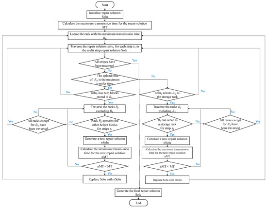 Initialize the recovery scheme. First, find the best single-stripe recovery scheme for the i-th stripe (Lines 1–2 in Algorithm 1). Currently, there are many methods applied in heterogeneous environment to reduce the single-stripe recovery time [13,24]. However, only AZ-recovery [24] considers the rack architecture, so it is chosen as the basis for the initialization of the recovery scheme in this paper. For a single stripe, AZ-recovery identifies the optimal recovery scheme with the shortest Maximum Transmission Time MT by enumerating all valid recovery schemes. Since each stripe has at most valid recovery schemes, Algorithm 1 needs to enumerate at most recovery schemes to obtain a near-optimal recovery scheme during batch recovery. In contrast, the enumerative approach would require enumerating recovery schemes to find the best recovery scheme. Specifically, is the number of optional helper blocks, r is the number of racks that can store recovery blocks, and s is the number of stripes. This demonstrates that Algorithm 1 can significantly reduce the time for initializing the recovery scheme during batch recovery. Then, initialize a multi-stripe recovery scheme Solu (Line 3), which consists of s optimal single-stripe recovery schemes.
