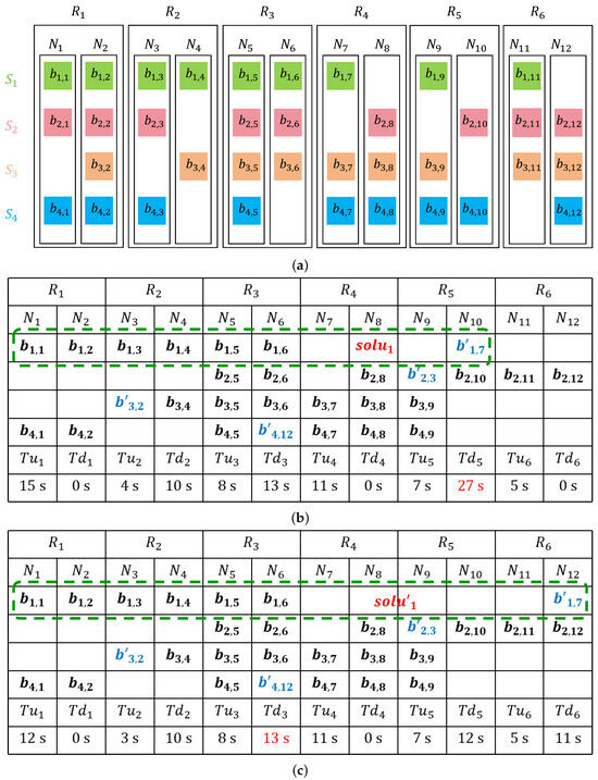 Example analysis: To facilitate understanding, this paper elucidates Algorithm 1 through an example. As shown in Figure 5a, there are 4 failed strips: , , , and . The cluster, which employs RS(6,3) encoding, consists of 6 racks and 12 nodes. Figure 5a and Table 3 display the data block layout and the transmission times between racks, respectively. Assume data blocks , , , and are damaged. From Figure 5b, it can be observed that rack has the maximum download time ( = MT = 27 s), and there are two strip recovery schemes that select rack to store the recovery blocks. Therefore, the recovery process is constrained by the downlink of rack . To reduce the download time of , rack is chosen as the rack to store the recovery blocks for ′, and ′ is used to replace in Figure 5c. As a result, the Maximum Transfer Time MT of the new recovery scheme in Figure 5c is reduced to 13 s.