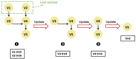 Example analysis: This paper takes the HBDAG recovered using PPR [4] method in Figure 6 as an example, where k = 4. Assume the data blocks stored in the four vertices are represented by , respectively. In the first phase, vertex sends a data block to its parent node (where is the decoding coefficient of ), and at the same time, sends another data block to its parent node . After completing the above data transfer, the HBDAG is updated by removing edge , edge , vertex , and vertex . In the second phase, the leaf vertex first combines the received with its locally stored data block , and then sends the result + to its parent node . After the data transfer is completed, the HBDAG is updated by removing edge and vertex . In the third phase, the leaf vertex combines the received result with its locally stored data block to recover the corrupted block , and then sends C’ to . Finally, after updating the HBDAG by removing edge and vertex , becomes the leaf vertex, at which point the recovery of the corrupted block C′ is completed.