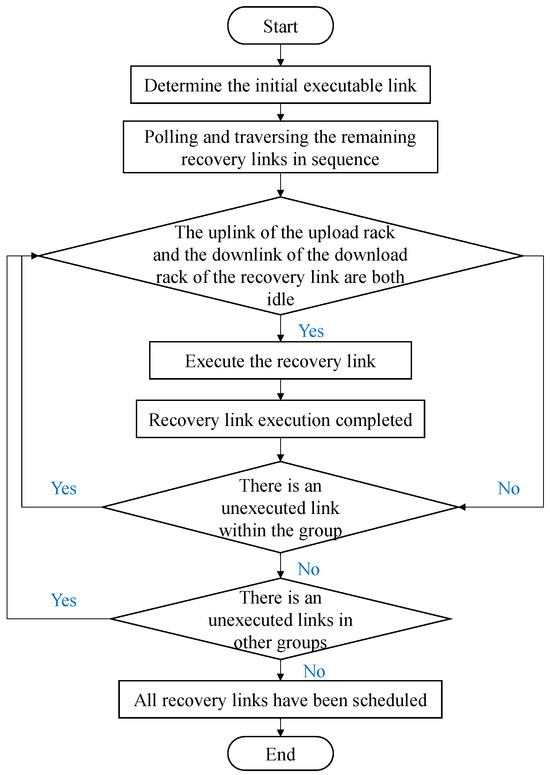 Algorithm flowchart: Since the methods for calculating the number of uplink and downlink accesses for each rack, as well as for evaluating the congestion level of each recovery link in Algorithm 2, have been detailed in Table 4 and Table 5. At the same time, the grouping method of recovery links and the sorting logic for each group and the links within them have been thoroughly explained in the algorithm details. Therefore, as shown in Figure 7, this paper only provides the flow for the recovery link scheduling portion of Algorithm 2. The method for determining the initially executable recovery links follows the group order, sequentially selecting one executable recovery link from each group according to the link order. In this way, it can be ensured that at the beginning stage, each group has a recovery link in execution state.