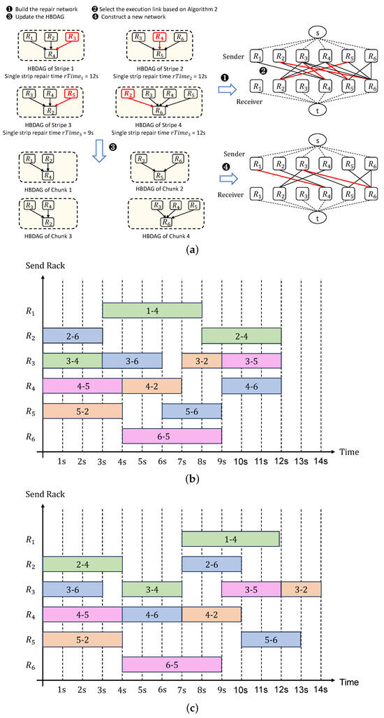 Example analysis: This paper provides an illustration of how Algorithm 2 operates through the examples presented in Table 4 and Table 5, Figure 8. Table 4 shows the cross-rack transmission times set for this example, which includes 6 racks and 13 cross-rack links (links marked in blue). Table 5 displays the calculation process for the link congestion level. Figure 8a shows the HBDAG determined by Algorithm 1 for four stripes with damaged blocks, with the red arrows in the figure indicating the scheduled links. It is evident that the HBDAG recovered using the CR method is presented here. Since cross-rack bandwidth is generally scarcer than cross-rack bandwidth, and according to the literature reviewed, the ratio of available cross-rack bandwidth to cross-rack bandwidth for each node is typically between 1/20 and 1/5, and in some extreme cases may drop to 1/240 [25,26,27], this paper assumes that the cross-rack transmission time is negligible, and it is necessary to convert the relationships between links and nodes in the HBDAG into relationships between links and racks before constructing the recovery network. This paper also assumes that when multiple helper blocks for recovering the same stripe are located in the same rack, these helper blocks need to be partially decoded locally before being sent to the rack where the recovery block is stored. Based on the above description, Figure 8a shows the HBDAGs established for 4 stripes with damaged blocks, and based on these 4 HBDAGs, a recovery network can be constructed on 14 vertices, which includes one source vertex s, one sink vertex t, 6 racks that may send helper blocks for recovery , and 6 racks that may store recovery blocks . Next, according to Algorithm 2, we begin to schedule the links. Since the recovery times for single stripes in Group 1, Group 2, and Group 4 are the maximum and equal, it is necessary to calculate the sum of the uplink access counts for the upload racks for each group separately: for Group 1, the sum of uplink access counts is calculated as = + + = 1 + 2 + 4 = 7; for Group 2, the sum of uplink access counts is calculated as = + + = 4 + 3 + 1 = 8; and for Group 4, the sum of uplink access counts is calculated as = + + + = 2 + 4 + 3 + 2 = 11. Because the sum of the uplink access times for the upload racks involved in Group 1 is the smallest, we prioritize scheduling the link with the highest congestion level in Group 1, which is → . At this point, there are no schedulable links in Group 1, so we proceed to Group 2 to schedule the link with the highest congestion level within the group, which is → , and so on. As a result, the first batch of executed links is {3–4, 4–5, 2–6, 5–2}. As shown in Figure 8b, where links within the same group are represented by the same color, the data transfer for both link → and link → is completed simultaneously. At this point, it is necessary to update the HBDAG for stripe 1 and stripe 4 first. Then, according to the group order, the unscheduled link with the highest congestion level and executable link → in the first group to which link → belongs is selected. Next, from the unscheduled links in the fourth group to which link → belongs, the link → with the highest congestion level and executable is selected, and so on. Based on Algorithm 2, the final link scheduling order obtained is {3–4, 4–5, 2–6, 5–2, 1–4, 3–6, 6–5, 4–2, 5–6, 3–2, 2–4, 3–5, 4–6}. As shown in Figure 8c, because CMRepair [6] does not group the links based on the stripes they recover, nor does it explicitly specify how to sort links with the same congestion level, the link scheduling order it obtains is {4–5, 3–6, 2–4, 5–2, 3–4, 4–6, 6–5, 1–4, 2–6, 4–2, 3–5, 5–6, 3–2}. This does not ensure that the links in the groups with the maximum single-stripe recovery time are executed without idleness, thus not minimizing the batch recovery time as much as possible. By comparison, it can be known that HBRepair reduces the batch recovery time from 14 s to 12 s compared to CMRepair [6], saving 14.3% of batch recovery time.