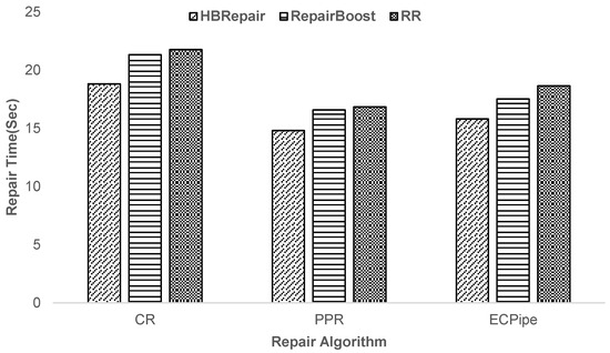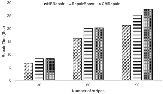 Experiment 1—Analysis of the impact of the number of stripes to be recovered on HBRepair’s recovery performance: As shown in Figure 9, with the increase in the number of stripes to be recovered, HBRepair’s recovery time significantly outperforms RepairBoost and CMRepair. CMRepair almost needs to traverse all recovery schemes for each stripe to be recovered when optimizing the recovery scheme. In contrast, HBRepair simplifies this process by introducing the “Help Array” and “Request Array” in Algorithm 1. HBRepair only needs to search for other recovery schemes consisting of help blocks from other racks except for the rack with the longest upload time for each strip to be recovered in the “Help array”. Or, in the “Request array”, HBRepair searches for other recovery schemes consisting of target nodes from racks other than the rack with the longest download time. Moreover, because helper blocks stored in the same rack have the same transfer time when sent to the target node, when a rack contains multiple helper blocks, only the recovery scheme consisting of one of the helper blocks for a single stripe needs to be considered. This greatly reduces the number of recovery schemes that each stripe to be recovered needs to traverse, decreasing the computation time of Algorithm 1, and this advantage becomes more pronounced as the number of stripes increases. RepairBoost only considers the recovery links connecting the leaf vertices (vertices without upload and download tasks) locally when scheduling the execution order of recovery links. In contrast, HBRepair takes a global approach, considering the scheduling of all recovery links, which allows it to perform recovery tasks more efficiently when dealing with a large number of stripes to be recovered. When recovering multiple stripes (30, 60, 90), HBRepair’s recovery time is reduced by 15.52–20.08% and 19.91–22.53% compared to RepairBoost and CMRepair, respectively. Upon analyzing Experiment 1, this paper observes that the improvement effect of HBRepair is relatively similar under different numbers of stripes, and the influence of stripe number on performance is not significant. Therefore, in designing the experiment, a compromise stripe number of 60 is selected as the default setting.