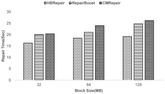 Experiment 2—Analysis of the impact of block size on HBRepair’s recovery performance: To investigate the effect of block size on the recovery performance of HBRepair, this paper conducts experiments with different block sizes, namely, 32 MB, 64 MB, and 128 MB, and records the recovery times. Figure 10 shows the recovery times for different recovery techniques as the block size varies from 32 MB to 128 MB. The recovery time of HBRepair is reduced by 12.16–22.62% compared to RepairBoost and 19.91–26.74% compared to CMRepair. Observations indicate that as the block size increases, HBRepair’s recovery time decreases more significantly compared to that of RepairBoost [5] and CMRepair [6], primarily due to the multi-threaded pipelining processing technique and the flexible link scheduling strategy adopted by HBRepair during the recovery process. Firstly, HBRepair significantly improves recovery efficiency by parallel processing of disk I/O and data transfer through multi threading. Secondly, in terms of link scheduling, HBRepair prioritizes the scheduling of links within the same recovered stripe group, a method that is more efficient than RepairBoost’s approach of scheduling only leaf links (where the upload node only uploads data blocks without downloading data blocks) and CMRepair’s method of scheduling all recovery links uniformly. This also enables HBRepair to schedule recovery links more flexibly, maximizing the continuous execution of each recovery link without idle time and making full use of network bandwidth resources. Especially when the size of the data block increases, that is, when the execution time of the recovery link is prolonged, HBRepair’s scheduling strategy can highlight its advantages more effectively. It will not cause some links to be in a waiting state for execution for a long time due to improper scheduling, thus effectively shortening the recovery time.