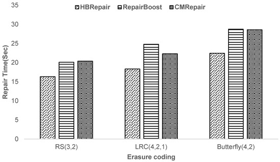 Experiment 3—Analysis of HBRepair’s recovery performance across different erasure codes: This paper uses representative erasure codes to verify the versatility of HBRepair. (i) Traditional RS(k,m), the most classic and popular erasure code. (ii) LRC(k,l,g), which divides k blocks into l groups. (iii) Butterfly(k,2), the erasure code with the minimum recovery traffic. As shown in Figure 11, compared to RepairBoost and CMRepair, HBRepair can reduce recovery time by an average of 22.25% and 19.74% for different erasure codes. Under the same encoding parameters, when HBRepair is applied to the Butterfly code, which requires all k + m + 1 remaining blocks to complete recovery, the determinism of the recovery scheme results in Algorithm 1 (helper block selection) having a relatively weaker impact on recovery performance. In contrast, the importance of Algorithm 2 (scheduling recovery links) becomes more pronounced. As Figure 11 indicates, HBRepair still maintains the performance improvement brought by Algorithm 2. This is because the second design technique not only ensures the parallel efficiency of data transmission but also optimizes the use of upload and download bandwidth, bringing it to saturation and effectively avoiding network congestion issues. Thus, it is proven that HBRepair can be applied to different erasure codes to facilitate recovery.