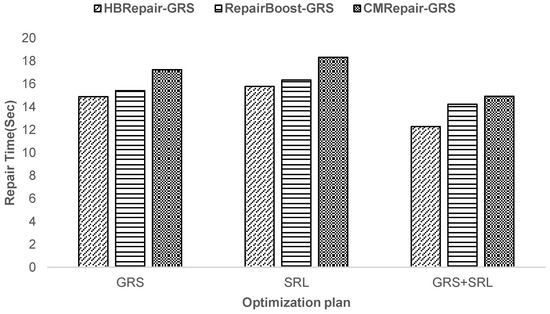 Experiment 5—Analysis of recovery performance under the individual effects of two design techniques: This paper conducts a decomposition analysis of HBRepair to demonstrate the effectiveness of each design technique. For simplicity, each technique of HBRepair is abbreviated as follows. (i) Generating Recovery Scheme (GRS), which produces a near-optimal recovery scheme to reduce the maximum transfer time (Algorithm 1, Section 3.2). (ii) Scheduling Recovery Links (SRL), which arranges the execution order of recovery links in a reasonable manner (Algorithm 2, Section 3.4). (iii) GRS+SRL, which is HBRepair. When using the GRS technique alone, the recovery links are scheduled randomly. When using the SRL technique alone, only the initialization process of Algorithm 1 is executed simply. Figure 13 shows the comparative results. First, it can be observed that the performance of SRL is superior to that of GRS, indicating that optimizing the scheduling order of recovery links is more effective than optimizing the recovery scheme. Second, HBRepair has the shortest recovery time, which is 12.87% and 17.9% less than GRS and SRL, respectively. This result indicates that these two optimization techniques complement each other, do not offset each other’s effectiveness, and instead enhance the overall recovery performance.