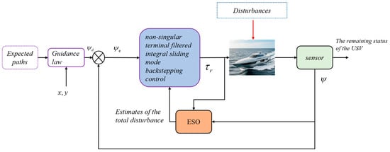 In this section, a control strategy is developed for USVs in complex environments, where first, the ESO is utilized to estimate the aggregate disturbances, which include the external disturbances as well as the model uncertainty term. Then, the estimated disturbances are fed back to the non-singular terminal sliding mode control system to keep it stable for a finite period of time. The specific design will be presented in subsequent Section 3.1 and Section 3.2. The control structure diagram is shown in Figure 2.