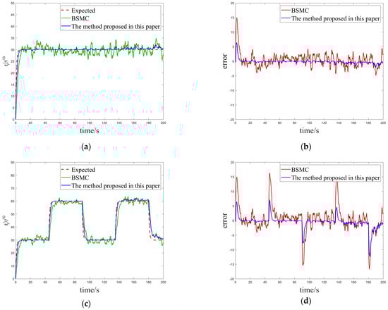 In this case, we focused on evaluating the performance of the control system under a single white noise disturbance. By carefully comparing the tracking results of the USV system in Figure 4a,c, it can be clearly observed that, both under constant heading commands and square sailing commands, the USV system exhibits faster and more accurate heading tracking capabilities as well as better interference immunity when using the innovatively designed algorithms in this paper compared to the conventional BSMC algorithms, which fully reflects its excellent dynamic response characteristics and high adaptability. To better visualize this advantage, we also comparatively analyze the tracking errors of the two algorithms under different desired headings, as shown in Figure 4b,d. These graphs visually show that the new controller proposed in this paper achieves a significant reduction in tracking error under white noise interference compared to the traditional BSMC algorithm, thus verifying its superior stability and robustness under complex environments and uncertainty conditions.