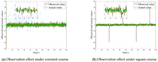 In Case 2, in order to further verify the effectiveness of the proposed algorithm, we further upgraded the experimental conditions, to not only retain white noise interference, but also introduce slowly changing sine interference, so as to get closer to the multi-source compound interference environment that may be encountered in real navigation, as shown in Figure 6. The actual initial course angle of USV is 5 degrees; The ideal course angle setting for the USV is the same as in Case 1.
