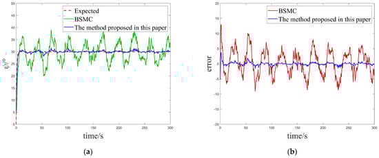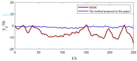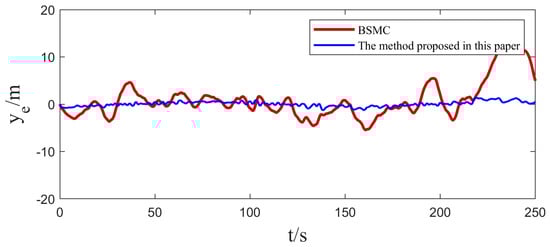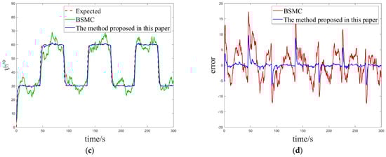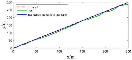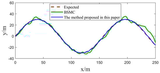 By carefully observing the path tracking effectiveness presented in Figure 9, Figure 10, Figure 11 and Figure 12, we can clearly conclude that both the traditional backstepping sliding mode control (BSMC) and the innovative algorithms proposed in this paper show satisfactory performances in meeting the basic requirements of system control performance. However, when comparing the control effects of the two in depth, it can be clearly seen that compared with the traditional BSMC algorithm, the algorithm proposed in this paper makes further significant improvements in the control performance of the system through the clever introduction of a new type of sliding mode surface and convergence law.