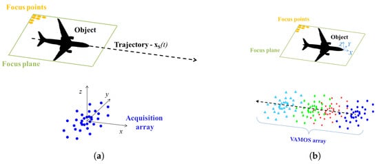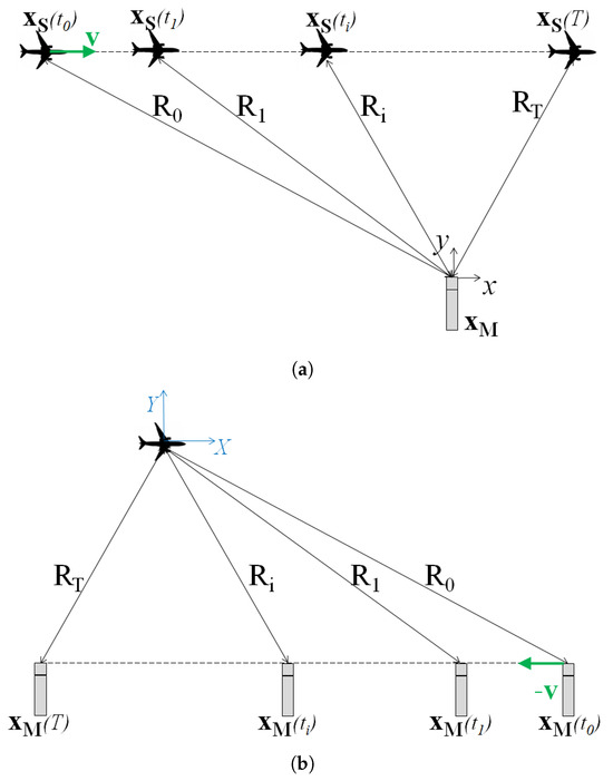 In Figure 1, it is also shown how the fly-over experiment appears if the procedure is applied. Practically, it changes the reference system to be fixed on the airplane, which thus sees the acquisition array moving with the same, but opposite, direction.