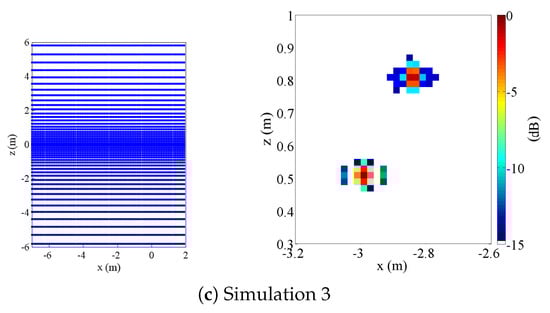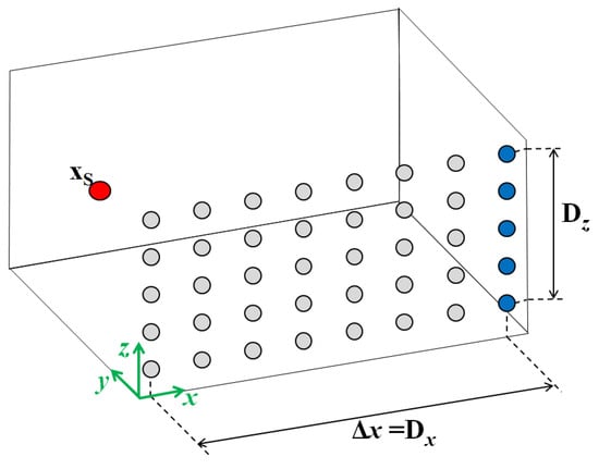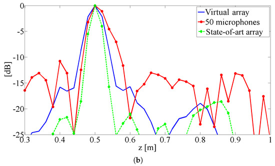 - The proposed procedure test with : the experiment is depicted in Figure 6. The acquisition array simulated is composed of 50 microphones arranged logarithmically along the z-direction, covering a 12 m aperture. was chosen in order to obtain a good SNR, but this number can be further optimized. The array is positioned symmetrically with respect to the x-axis. The proposed procedure was applied by considering s, without overlapping, and by considering Equation (11) as valid. The virtualized array obtained is thus composed of 4450 microphones arranged logarithmically along the y-direction and uniformly along the x-direction. The aperture gained in the x-direction is about 9 m, while the aperture in the z-direction remains unchanged.