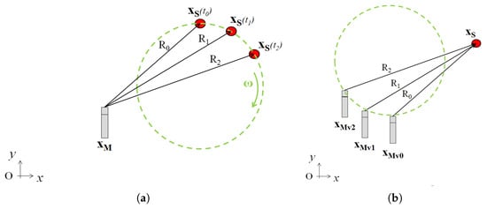 Scheme of the proposed procedure approach on a rotating object (a) Source motion, (b) Virtual array.