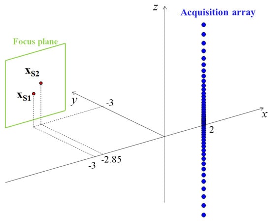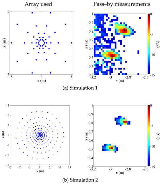 In order to demonstrate the performances of the proposed procedure and to analyze the limits and sensitivity of the technique, a numerical model has been developed. The simulated conditions are illustrated in Figure 5: two monopole sources were considered, moving with the same velocity and emitting at the same frequency kHz. Their distance in the x direction is equal to 0.15 m, and in the y direction, it is 0.3 m. All the beamforming maps of beamforming were calculated on a focus plane with a resolution of 0.02 m. Up to this point, the analysis was performed by considering a single microphone acquisition, which, when virtualized, gives rise to a uniformly spaced linear array. In this subsection, the investigation progresses to actually check the resolution of the virtual array. Unlike before, a multiple sensor acquisition array is considered.