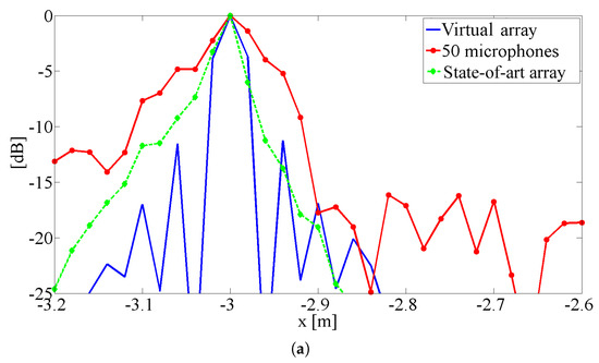 In Figure 7, the same results are shown as sections passing through one source (the behaviour across the other is quite similar). Again, it is evident that the proposed procedure’s results are quite similar to those of the state-of-the-art array and significantly better than those of the standard array. On the other hand, the section in x direction shows evident sidelobes in the plot. In this implementation, the proposed procedure generates a uniformly spaced array in the direction of motion, and the sidelobes are the typical drawback. The spacing of the virtual microphone is discussed in the following section. To better understand the behavior of the proposed algorithm, the standard array, the state-of-the-art array, and the proposed procedure test were compared with steady sources, thereby eliminating contributions due to de-Dopplerization and source motion and highlight only the effect of the array shape. In a strict sense, this is a paradox for the proposed procedure, as it cannot work without source motion. To make this comparison, an array with real microphones, arranged in the same pattern as the vitual array generated by the proposed procedure, was considered. In practice, we simulated the availability of a large number of real microphones and arranged them in the same pattern as the virtual ones calculated by the proposed procedure.