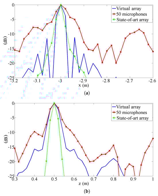 Sections of results obtained on steady source with conventional beamforming (for the proposed procedure with 4450 real microphones in the pattern of the array): (a) along the x direction, (b) along the z direction.