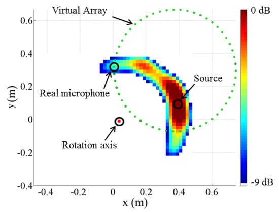 To demonstrate the performance of the proposed procedure under real-world conditions, a simple test was conducted. A single-frequency sound source emitting at kHz was installed on a bladed disk with a radius of m. The disk was driven by an electric motor, with its velocity measured using an encoder with 4096 pulses per revolution. A microphone is placed 1.2 m away in the axial direction. The motor velocity was tuned such that the tangential velocity of the sound source was . All beamforming maps were calculated on a focus plane with a resolution of 0.02 m. The test was performed using a single microphone acquisition, which, when virtualized, resulted in an equally spaced circular array with . The beamforming map obtained is shown in Figure 10. Despite using only a single microphone, the technique successfully localized the sound source. The map is well-defined, and the source is correctly identified. Additionally, the map exhibits a wake effect along the real source trajectory, highlighted by plotting the results with a dynamic of 9 dB. This effect arises due to inaccuracies in defining the relative position between the rotor and the microphone, an aspect that requires careful evaluation.