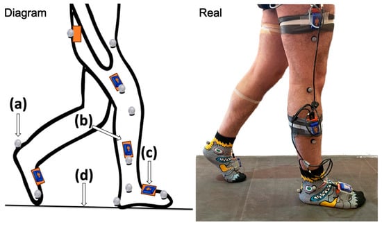 Placement of data collection methods. (a) In gray circles, placement of 14 mm VICON markers according to the Plug-In Gait Lower Body AI model. (b) In orange rectangles, the XSENS IMUs are placed symmetrically on the lower limbs: on the lateral part of the thigh and leg, the dorsum of the foot, and the posterior part of the hip. (c) In blue chips, TRIDENT VICON: IMUs are placed symmetrically on the side of the thigh, leg, and back of each foot. (d) GAITRite mat is 5.79 m long and 0.89 m wide.