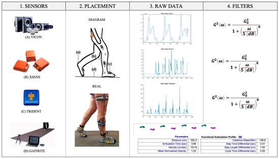 Diagram of the methodology (from left to right) implemented as part of the measurement protocol: data acquisition, data processing, and signal filtering. (1) Sensors indicate the four methods of obtaining data. (2) Placement, location of the sensors on the diagram, and the subject’s body for measurement. (a) In gray circles, placement of 14 mm VICON markers. (b) In orange rectangles, the XSENS IMUs. (c) In blue chips, TRIDENT VICON. (d) GAITRite mat. (3) Raw data and graphs of the unprocessed signals from each sensor detecting the right foot’s magnitude. (4) Filters describe the filter equation used for the raw data.
