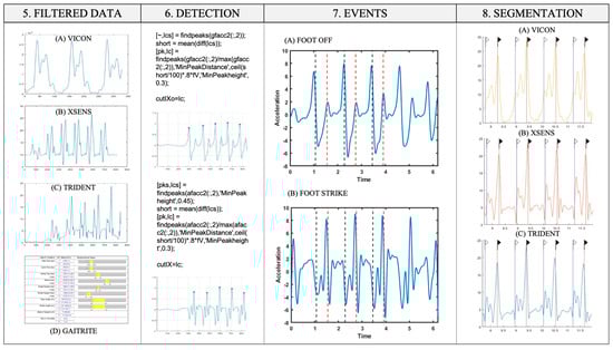 Diagram of the methodology (from left to right) implemented as part of the measurement protocol: the processed data from each sensor, the event detection algorithm, the events detected in the acceleration signals, and the signals segmented by the events marked in all the signals. (5) Filtered signals from all sensors consist of signals from the right foot’s magnitude. (6) The event detection algorithm is explained in MATLAB code. (7) The event detection algorithm is applied to each magnitude and component of the IMU signals, and each gear’s foot-off and foot-strike events are detected. (7A) The y component of the linear acceleration is shown. (7B) The y component of the angular acceleration is shown. (8) The events detected by the algorithm in each of the acceleration signals from each sensor are shown.