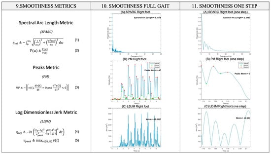 Diagram of the methodology (from left to right) implemented as part of the measurement protocol: equations of the smoothness metrics, application of the smoothness metrics to the entire gait signal, and application of the smoothness metrics to the segmented stride signals of each march. (9) Equations of the smoothness metrics (Equations (1)–(5)), are used to evaluate the motor gesture of walking. (10) Smoothness metrics are applied to the complete signal in its components and magnitude. (11) Smoothness metrics are applied to acceleration signals in their components, and magnitude is applied to the signal segmented by gait strides.