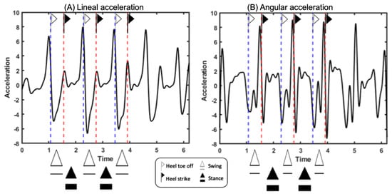 Both graphs show the events marked by the signal maxima to determine the foot-off and foot-strike events; the white flag indicates the detection of standing foot-offs, and the black flag indicates the detection of foot-strikes. White triangles indicate the signal zone between standing foot-off and foot-strike, indicating the swing phase. The black triangles indicate the signal zone between the foot-strike and the following standing foot-off, indicating the stance phase. (Left) graph (A) shows the linear acceleration signal on the y-axis (pitch), and (right) graph (B) the angular acceleration on the y-axis (pitch).