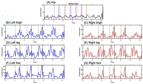 Subjects walked an average of 3.88 m from initial contact to final contact, with an average duration of 3.43 s, cadence of 105.6 steps per minute, and velocity of 1.138 m/s. They took a total of six steps, with 38.4% of their time on the swing and 61.6% on the stance, and with 38.8% of their time in single support and 22.8% in double support. They had a step time of 0.56 s and a cycle time of 1.10 s, and they had a step length of 63 cm and a stride length of 127 cm. Once the gait events were identified, the signals from each of the IMUs were segmented into each segment of the biomechanical model, as can be seen in Figure 5. In Figure 6, The signals obtained from the XSENS located (A) in the back of the pelvis, and on the lateral parts of the (B) left thigh, (C) right thigh, (D) left leg, (E) right leg, (F) left foot, and (G) right foot. In Figure 6, signal (A), the solid blue line represents the left lateral foot-strike, and the dashed line represents the standing foot-off, and the red line indicates the same but for the right lateral foot-strike. The foot-strike and foot-off events are also marked on signals B, C, D, E, F, and G. The solid black line represents foot-strikes, and the dashed line represents standing take-offs. When the two methods for identifying events (VICON procedure vs. MATLAB algorithm) were compared, an error of less than 2% was obtained in each of the 20 subjects’ walking steps (≈666 measurements).