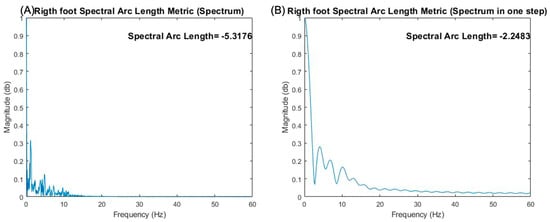 The graphs obtained from the SPARC metric in analyzing the entire gait (A) and the study of a stride with the SPARC metric in magnitude (B).
