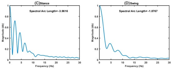 The smoothness in the SPARC metric in the stance phase on the left side (C) and in the swing phase on the right side (D) for a stride.