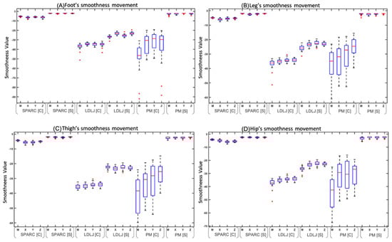 With the gait events identified as foot-strike and foot-off, the signals were segmented by strides, and the support and swing phases of the gait were identified, which made it possible to apply the smoothness metrics in these phases and determine their contributions. When using the smoothness metrics (SPARC, LDLJ, and PM), significant differences were found between the results with the complete signal (C) and the signal segmented by strides (S). Likewise, upon analysis, it was found that the SPARC metric applied to the complete signal and the segmented signal had the most significant sensitivity to the gait smoothness, unlike the findings of other studies [,]. Another insight we made was that implementing smoothness metrics less commonly used can lead to a new approach to gait analysis. The results also indicated that once the gait signal is segmented, it is essential to consider the anatomical locations of the IMUs, given that there were significant differences between the smoothness results in the different positions of the IMUs according to the biomechanical model proposed. The smoothness data of the IMUs located in the foot segment had the least variability recorded, so this was the segment in which the best results for smoothness were obtained; this is since the foot is the most distal segment, which experiences a more significant change in acceleration and deceleration compared to the other segments [,]. Some authors [,] suggest that placing the sensor on the waist is much less intrusive and propose that the minimal weight and volume of the IMU cannot alter the waist measurement. However, with the results from this work, we assert that placing two IMUs of the same size on each foot can also prevent interference and, therefore, modification of the subject’s gait.