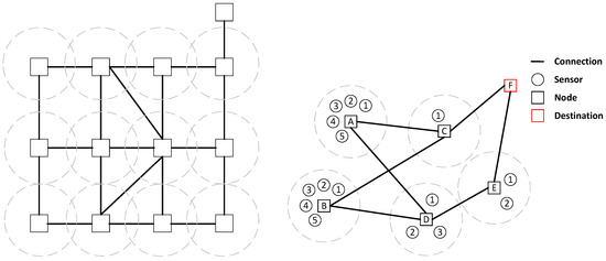 Based on the IoT application scenario in underground construction, Figure 2 is a multi-sensor IoT application topology. In this topology, node F is the endpoint of the cloud device. The four base stations and D form a mesh topology through a cable. The sensor (1, 2, 3, …) sends wireless data to the base station, and the base station needs to send data to the endpoint F through the multi-hop network topology. Assume that the No. 1 sensor of the base station A sends data to A, and A can send data to F through multiple path selections. When the network does not consider other node data, the transmission problem is the shortest-path problem, which the shortest-path algorithm can solve. However, when other nodes in the network also need to send data, considering the delay caused by node caching, queuing, etc., how to send all data to focus F in the shortest time is a problem that needs to be studied such as in this paper.