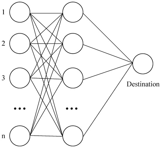 Let and ; this allows us to describe this problem as a multi-task, multi-processor scheduling problem [23] with W tasks and C processors. Nodes 1 to n in the figure are base stations with sensor data, and a column of nodes in the middle is a routable base station. Each sensor data can face the same n routing nodes after departure. It is evident that this transformation process has polynomial-time computational complexity. □