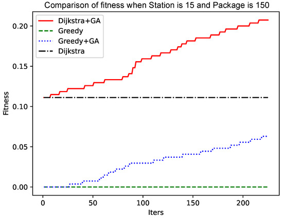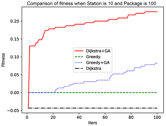 When the number of points is 10 and the number of packets is 100, the experiment is carried out. The results are shown in Figure 4. Although the initial population using the Dijkstra algorithm is poor, the initial convergence is extremely fast, and a better solution can quickly be found. The convergence rate slows down in the later period, but it is constantly approaching the optimal solution. The faster initial convergence may be because the solution of the Dijkstra algorithm is poor. A better solution can be found after a simple crossover, mutation, and roulette algorithm. The genetic algorithm based on the greedy algorithm in the figure initially has a not-too-bad solution. Still, the initial crossover and mutation are not flexible, and to a certain extent, it is subject to the solution generated by the greedy algorithm. The medium term becomes faster because a better solution than the initial solution is generated, and the cross-matching roulette algorithm accelerates the convergence speed.