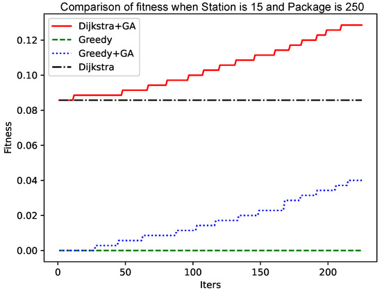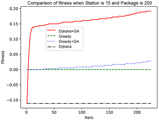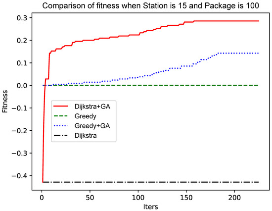 In the experiment, the result of the greedy algorithm is used as its fitness benchmark (0) to minimize the impact of randomness on the experiment. In each experiment, the fixed graph and data packet input are run 10 times, and the average value of the fitness of the corresponding iteration times is taken as the result of the fitness of the 10 experiments.