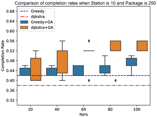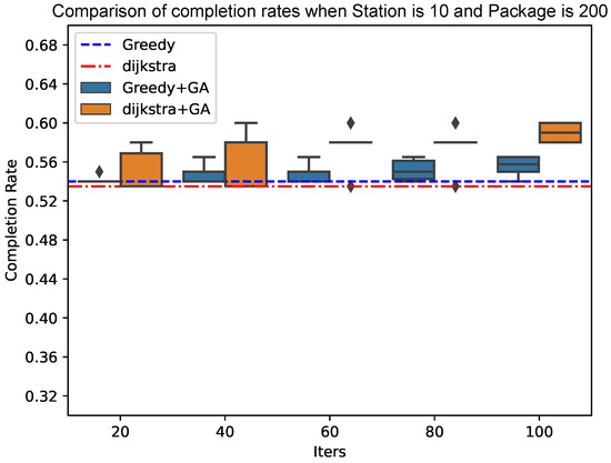As shown in Figure 10 and Figure 11, the genetic algorithm based on Dijkstra has more advantages in the final result of the completion rate than the genetic algorithm based on the greedy algorithm. At the same time, the convergence speed of the genetic algorithm based on Dijkstra tends to be faster when the total number of packets increases; the advantages of the genetic algorithm based on Dijkstra will be more obvious.