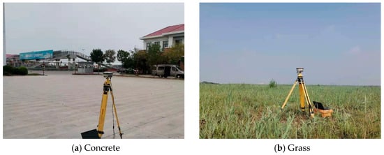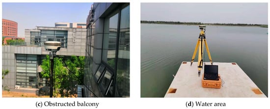 The experimental site is located in the Binhai New Area of Tianjin, where monitoring stations were set up in three environments: concrete, grass, and an obstructed balcony, as shown in Figure 2. During the experimental procedures, all GNSS receivers were uniformly set up to function in a tri-constellation mode encompassing GPS, BDS, and GLONASS. The configuration included a cut-off angle of 15° and a sampling rate of 10 Hz. The calibration precision of the GNSS real-time kinematic (RTK) system is ±10 mm horizontally and ±20 mm vertically. Given that internal observational noise is solely related to the monitoring equipment itself, under consistent device configuration and differential calculation, any variations in displacement obtained from different environments can be primarily attributed to multipath effects. To avoid the influence of accidental factors and ensure result reliability, five sets of measured data, each with a duration of 1200 s, were collected and analyzed in each environment.