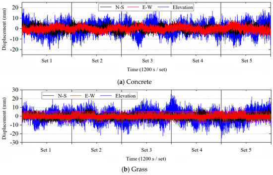 The monitoring signal obtained by the GNSS-RTK difference calculation is the three-dimensional coordinate value in the World Geodetic System 1984 (WGS84) coordinate system. First, the monitoring signal needs to be processed by coordinate conversion. The absolute coordinate value in the WGS84 coordinate system is converted to the displacement value in the Cartesian coordinate system. Then, the displacement value is subtracted from the average to obtain the GNSS-RTK displacement time series. GNSS-RTK displacement time series in different environments are given in Figure 3. Overall, the GNSS-RTK series in the concrete, water, and grass environments remain relatively stable, while in the obstructed balcony environment, they exhibit multiple instances of amplitude jumps and drifts. Additionally, the amplitude of GNSS-RTK series in the north–south and east–west directions is smaller than in the elevation direction, indicating that monitoring accuracy in the horizontal direction is higher than in the vertical direction.