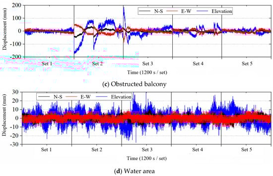 Specifically, the displacement amplitude of the monitoring signal primarily ranges within ±10 mm horizontally and ±20 mm in the elevation direction in the concrete, water, and grass environments, aligning with the instrument’s calibrated accuracy and demonstrating the reliability of GNSS-RTK monitoring. In the obstructed balcony environment, the GNSS-RTK monitoring signals for the 2~4 sets show significant amplitude jumps, particularly severe in the elevation direction, with values predominantly distributed within ±200 mm, which does not meet the specifications of structural monitoring requirements. In contrast, the first and fifth sets of monitoring signals remain relatively stable, with horizontal displacement amplitudes mostly within ±20 mm and elevation amplitudes around ±30 mm. The instability of the monitoring signal in the obstructed balcony environment results from the building obstruction, which significantly reduces the number of visible satellites and adversely affects differential positioning.