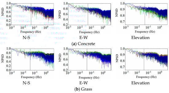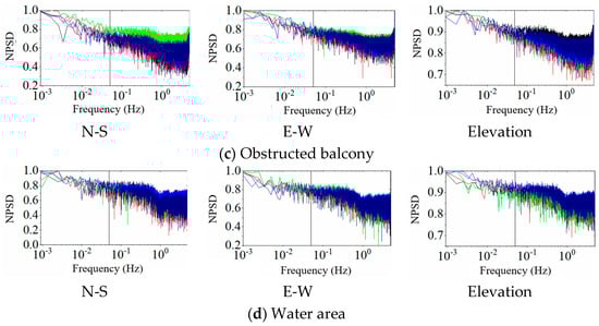 To investigate the spectral characteristics of GNSS-RTK background noise in different environments, the NPSD function of GNSS-RTK is calculated, as shown in Figure 4. For ease of comparative analysis, the frequency values on the X-axis were logarithmically transformed, and the five datasets for each environment and direction were superimposed. In the low-frequency region, the multipath error is dominant and the noise energy is relatively high, indicating that the multipath error has a significant impact on GNSS-RTK monitoring results. In contrast, internal white noise from the instrument is widely distributed across the whole frequency domain, with relatively uniform noise energy. Specifically, in the concrete, grass, and obstructed balcony environments, the low frequency and high energy multipath error is primarily concentrated within 0.04 Hz. Therefore, when the energy of low-frequency noise is high and the fundamental vibration frequency of the monitored structure is much higher than 0.04 Hz, the filter method can be used to de-noise low-frequency noise components, such as Chebyshev and Butterworth methods. Additionally, model correction methods can be used to mitigate multipath error based on its periodic repetition, such as independent component analysis (ICA) and principal component analysis (PCA) methods. For the interference of internal white noise, separation methods based on white noise properties can be considered for de-noising, such as the empirical mode decomposition (EMD) and wavelet transform methods.