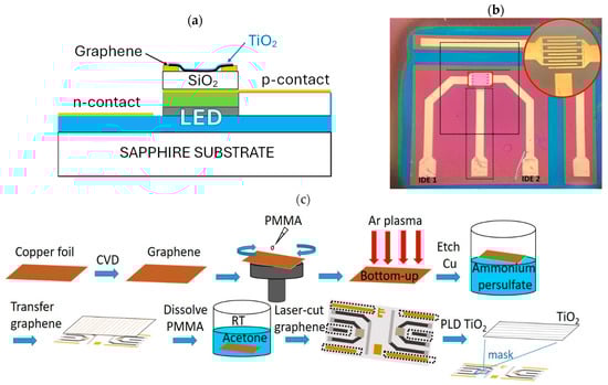 The InGaN-based μLPs had a layout similar to that in Ref. [] with a μLED and interdigitated electrode (IDE) area of 190 μm × 250 μm. A schematic cross-section and a photograph of the device are shown in Figure 1a,b, respectively. The μLPs grown on sapphire wafers were diced in pairs, and the dimensions of a die with two devices on it are 4.05 × 5.6 mm2. Single-layer CVD graphene grown on a polycrystalline copper foil (Graphenea, San Sebastian, Spain) was transferred onto the μLP die using a wet transfer procedure [Figure 1c]. After cutting the graphene/Cu/graphene sheet with an appropriate size and covering it with a layer of PMMA, argon plasma treatment (Diener Tetra 30/50, Plasma Surface Technology, Ebhausen, Germany) was applied to remove the graphene from the uncovered side of the sheet. The next step was to remove copper from the PMMA/graphene/Cu sheet by keeping it in a 1 M ammonium persulfate (Sigma-Aldrich, Steinheim, Germany) solution for two hours. The PMMA/graphene film was then rinsed several times with deionized water, transferred onto the μLP in water, and left to dry overnight. Finally, the μLP with the transferred PMMA/graphene layer was baked at 120 °C for an hour and then placed in pure acetone (≥99.8%, Thermo Fisher Scientific, Seelze, Germany) for 2 h to dissolve the polymer layer. After drying the device, a part of the graphene was selectively removed from its surface to galvanically separate the LED and sensor circuits (see Figure 1b). The electrical isolation between the sensor and LED circuits was accomplished in two stages: by a short 1 min Ar plasma etching while masking the middle area around the interdigitated electrodes (IDE) and then by laser cutting of graphene near the IDE. The black rectangle in Figure 1b shows the masked area during plasma etching for graphene removal, and the dotted lines show the laser-cutting trajectory. A femtosecond laser (ORIGAMI O-05LP, Istanbul, Turkiye) with a pulse energy density of 0.7 mJ/cm2 was used to cut a few μm wide path through graphene without damaging the underlying μLP. Thereafter, pulsed laser deposition (PLD) was applied to produce a functionalizing layer on top of the graphene. Before deposition, the μLPs with graphene were heated in a PLD chamber at 150 °C in a vacuum (10−6 mbar) for 1.5 h. PLD was performed at 45 °C in 0.05 mbar N2 gas using a KrF excimer laser (COMPexPro 205, Coherent Lambda Physic GmbH, Göttingen, Germany) with a pulse frequency of 5 Hz and an energy density of 5 J/cm2 for target ablation. The number of laser pulses used for target ablation was 100, which resulted in a TiO2 layer with a thickness of about 0.5 nm [].
