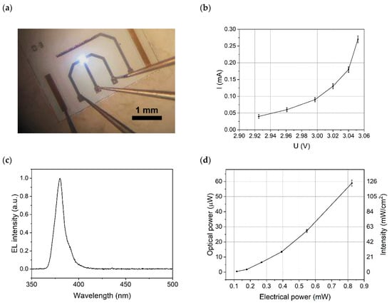 The characteristics of the μLP are shown in Figure 3, where (a) shows the working device with microprobe contacts and panel (b) plots its volt–ampere characteristic curve. The peak emission wavelength of the LP was 380 nm [see the spectrum in Figure 3c]. Figure 3d shows the optical power and intensity on the sensor area versus the consumed electrical power. The external quantum and wall-plug efficiencies had incidentally very similar numerical values, being 0.4 ± 0.04% near the threshold current of 40 μA and increasing to 7% at higher currents.
