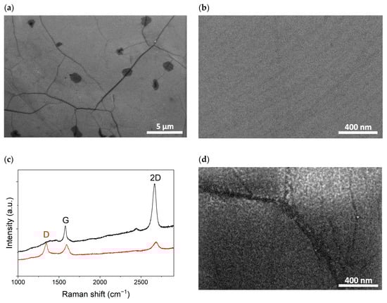 SEM images of graphene in the electrode gap of the μLP are shown in Figure 4a,b. The spots that are darker in color in Figure 4a are commonly observed in CVD graphene and are related to the multilayer graphene. The dark linear features, which are also commonly observed, are due to the topography of the polycrystalline Cu-foil used in the synthesis process and the grain boundaries of graphene. The Raman spectrum [Figure 4c] contains mainly two bands, a G-band at 1577 cm−1 and a 2D-band at 2664 cm−1, with an intensity ratio of 1:3, which is characteristic of single-layer graphene []. The XPS spectra of the graphene used in the present study were recently analyzed in detail in Ref. []. Deconvolution of the C1s peak resolved sp2 carbon (87%), sp3 carbon (7.5%), and oxidized (C–O, C=O, O=C–O) species (5–6%). After the PLD of TiO2 on top of graphene, a defect-related band D (1344 cm−1) emerges in the Raman spectrum. The SEM image [Figure 4d] shows the granular morphology of the deposited material, uniformly coating the graphene. The linear features observed in the pristine graphene image “shine” through a thin TiO2 coating and are also visible in Figure 4d. For comparison, Figure 4b shows an image of pristine graphene at exactly the same scale, which does not have a granular oxide layer on top but instead shows characteristic streaks formed by the copper substrate during growth.