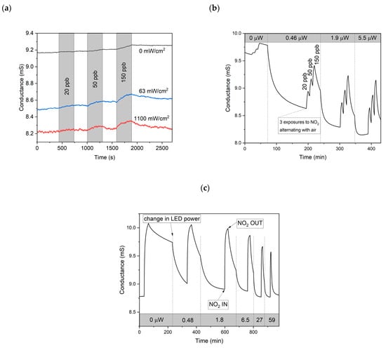 The sequence in Figure 5b starts with NO2 gas exposures in the dark; three relatively small raising steps in conductance can be seen. CVD graphene is p-doped by adsorbed oxygen and water molecules in air [,], and MOX-coated graphene retains this conductivity type []. Because NO2 acts as an electron acceptor during adsorption, hole doping is further promoted in the presence of NO2, increasing the conductivity. However, the gas response in the dark was slow and showed prolonged recovery. After switching on the μLED at its lowest power (see Figure 4b; 70 min after the start of the measurement), the conductance of the samples held in synthetic air starts to decrease and stabilizes at a lower level. Such a persistent photoresistance effect has also been observed in pristine graphene and is explained by the photoinduced removal of oxygen and the associated decrease in the density of electron holes in graphene []. It can be seen from the figure that under the influence of UV radiation, the gas responses become faster, and the recovery is improved with increasing optical power. The values of the applied optical power are indicated on top in Figure 5b as being directly relevant to the photoinduced phenomena; the values of the electrical power applied were 0.12, 0.18, and 0.24 mW, respectively.