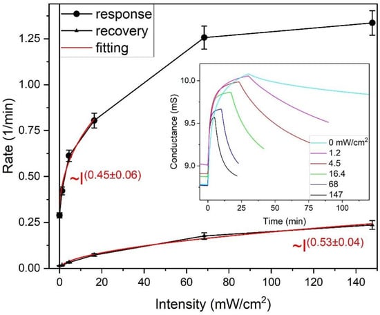 Initially, the response rates to the step-like NO2 gas injection increase rapidly with the increasing light intensity (Figure 6). The rate dependence can be fitted with the power dependence, but it clearly reaches a plateau above 60 mW/cm2. Saturation can be considered an artifact because it is actually determined by the instrumental gas exchange rate, which can be estimated from the chamber volume and the flow rate to be slightly above 1 min−1. The recovery process was slower and could be fitted with a power law for the entire range of light intensities. Both approximations using the power law led to exponents close to 0.5.