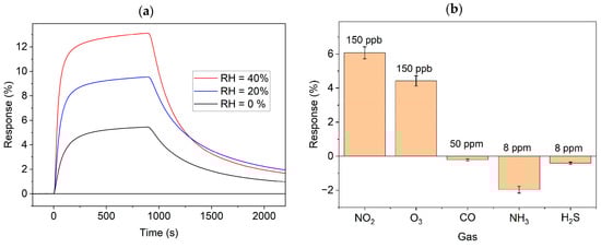 Finally, to characterize the selectivity, we checked the cross-sensitivity to several other toxic gases and humidity (Figure 7). Panel (a) compares the dynamic relative responses (relative change in conductance) to NO2 gas at three different RH levels at the irradiation intensity of 60 mW/cm2. The responses appeared to be somewhat stronger and faster in the humid air. The impact of humidity is a common and complex phenomenon in chemiresistive sensors []. In a recent study [], the dependence of the light-assisted response to NO2 on humidity was ascribed to the decrease in active sites and increase in carrier concentration owing to adsorbed water molecules and OH groups. The latter factor also explains our results through the deactivation of the recombination centers by adsorbed water molecules.
