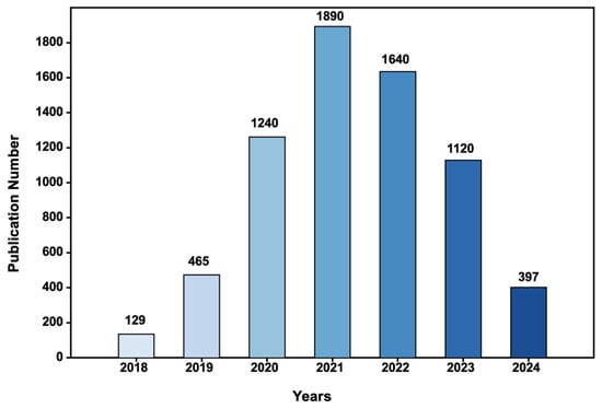 Due to differing application scenarios and target requirements, face mask detection algorithms during the COVID-19 pandemic can be broadly categorized into two types. Firstly, there are those designed for environments such as checkpoints and entry/exit control points, where the distance between individuals and cameras is relatively close and the acquisition of high-quality images of single facial targets is enabled. Consequently, higher detection accuracy is required, typically employing traditional convolutional neural networks (CNNs) [] for feature extraction and image classification [,,,,,,,,,,,,]. Secondly, there are algorithms intended for public places with high foot traffic and dense crowds, where complex backgrounds and multiple interfering factors present greater challenges for detection tasks, especially with multi-scale facial targets, wherein small-scale faces are more prevalent. To address this, numerous researchers have proposed corresponding enhancement methods based on object detection models [] to accommodate the detection needs of multi-scale face masks [,,,,,,,,,,,,,,,,,,,,,,,,,,,,,,,,,,,,,,,,,,,,,,,,,]. Figure 1 illustrates the number of relevant publications on face mask detection and recognition collected from 2018 to 2024. Concurrently, issues surrounding masked face recognition have also become increasingly prominent, with factors such as mask types, camera resolutions, and degrees of occlusion exacerbating the difficulty of detection and recognition. Moreover, aspects such as real-time video analysis and privacy protection have imposed higher demands on system design [].