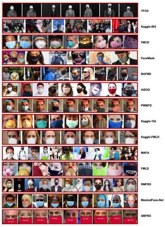 Over the past few years, many face mask datasets have been introduced to solve several tasks related to COVID-19. During the pandemic, the demand for suitable large-scale face mask image collections increased significantly. Consequently, new datasets targeting face mask detection and recognition, masked face detection and recognition, and other related issues were introduced. In Table 1, we summarize the primary datasets associated with COVID-19, compare their characteristics, and present some example images in Figure 2.